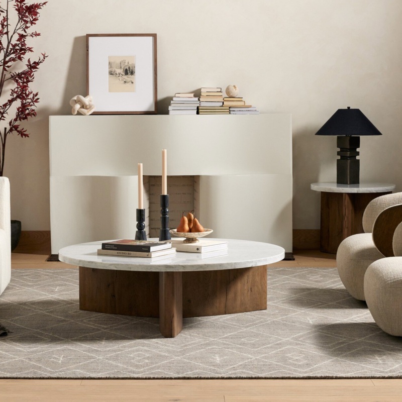 Mixed materials make the table. Finished in a rustic grey, thick-cut oak forms a chunky pedestal base for a rounded tabletop of white Italian marble, with beautifully subtle natural veining. Designed in partnership with longtime Four Hands collaborator Thomas Bina and Brazilian designer Ronald Sasson.