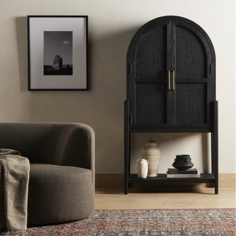 Introducing the Tolle Bar Cabinet, a fusion of French-inspired arches with Scandinavian simplicity. This design-forward piece features a striking black stained exterior and a natural oak interior, adding a touch of elegance to any room. Keep your bar essentials organized and easily accessible with this sophisticated cabinet.