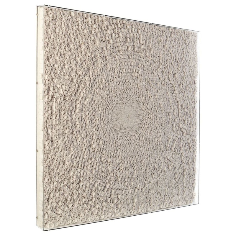Eye of the Storm by artist Daniel Fey is a mesmerizing piece of wall art that imbues an interior space with a stunning sense of depth and dimension. Hand-made from hundreds of individual rolls of paper atop canvas, the piece showcases intricate spirals that get smaller as the design reaches the center. The piece is displayed within a clear acrylic box and affixed with keyhole hangers.