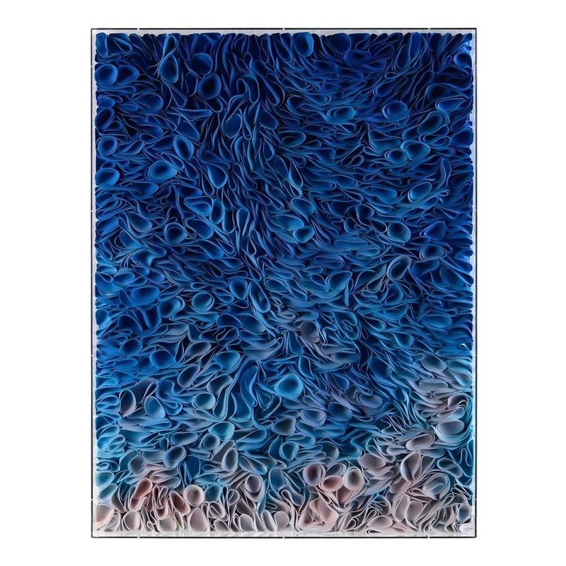 Daniel Fey’s intriguing, three-dimensional art is created using individual pieces of organic material in shades of blues and green that are layered in various depths and directions. The piece is framed in a deep acrylic box.
