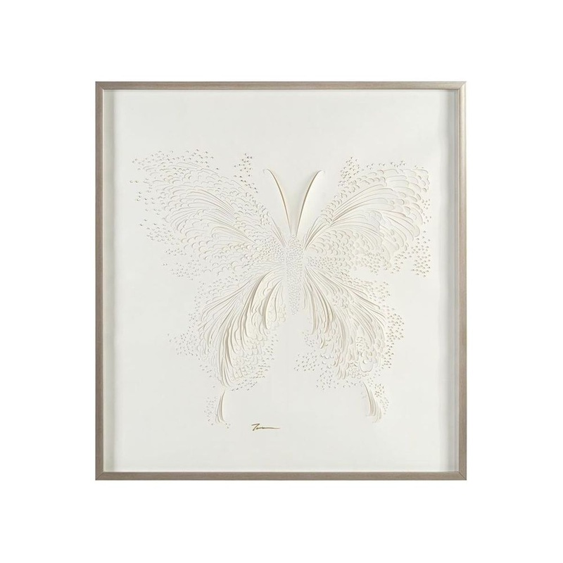 Terry Fey’s intricate and delicate cuts in ivory paper bring this beautiful butterfly to life. The three-dimensional creation is surrounded by a champagne wood frame.