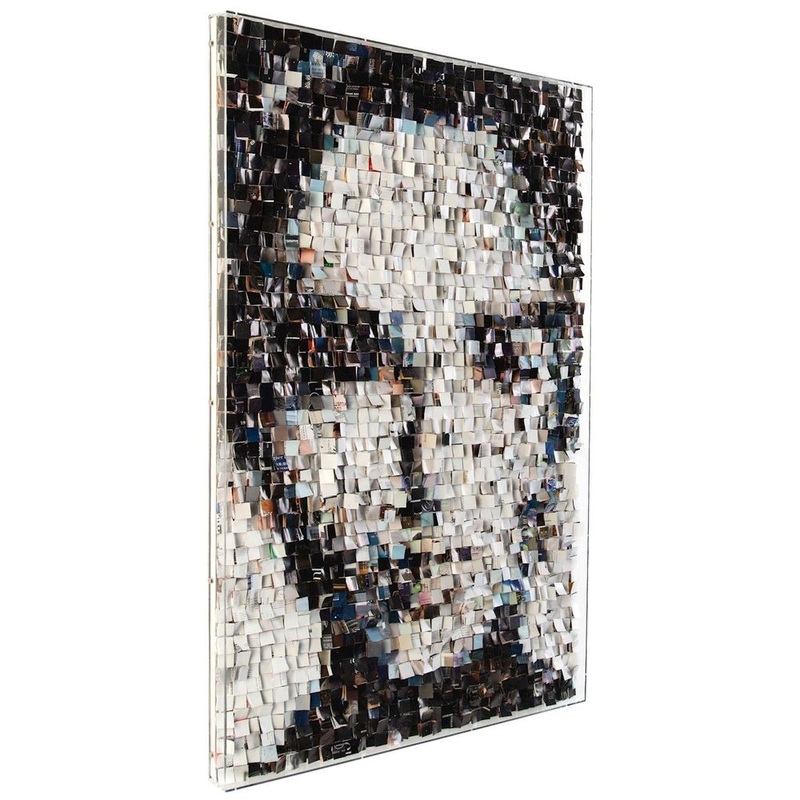 Tessellated Projections by artist Daniel Fey depicts the visage of a woman, carefully pieced together by small paper squares of varying color. Achromatic tones of black and white take center stage, subtly accented by shades of blue, purple, pink, and brown. The piece is gently nestled within an acrylic box frame, reliably protecting the piece while imbuing it with a sense of contemporary flair.
