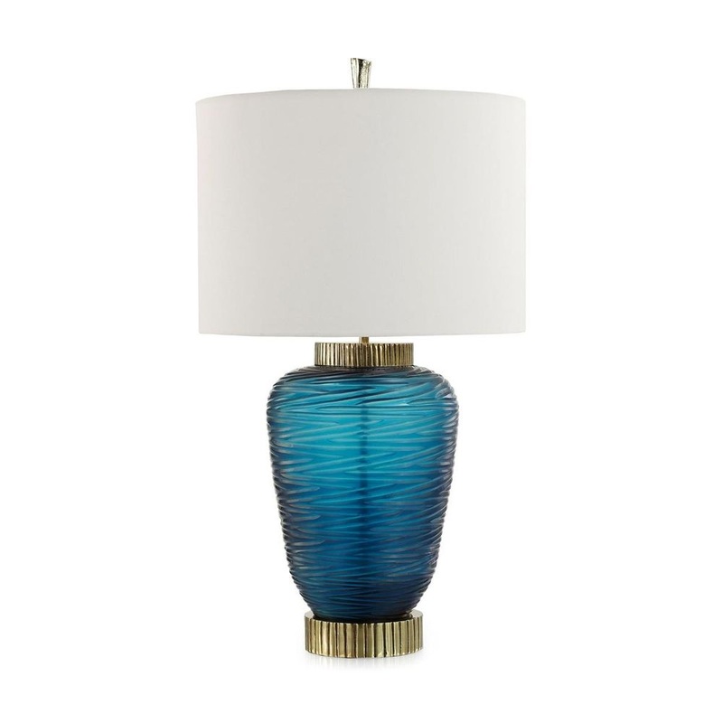 The Tornado Table Lamp is a gorgeous design statement with an alluring sense of motion. Crafted from art glass, this round lamp in a vivid midnight blue color displays intricate textures that evoke imagery of gale force winds. Antique Brass accents at the base and neck show a grooved look and elevate the aquatic motif with opulent tones.