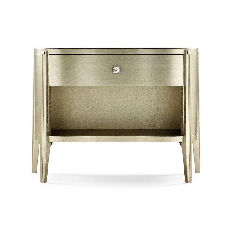 Constructed of American walnut with a transparent, lacquer finish. Top features walnut veneer in a pattern reminiscent of straw work. Hardware is cast from brass, acid dipped and hand rubbed to achieve a natural patina. Drawer box interiors are finished to match the exterior of the cabinet.