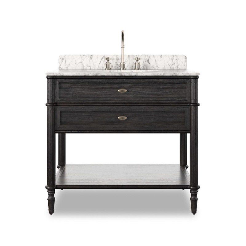 Influenced by vintage European lines, this inspired bath vanity brings a sense of calm and serenity to the bath space. Crafted from solid oak and veneer with rounded corners and tapered spindle legs in a satin black finish, aged satin brass hardware and a Carrara marble top. Includes top faux drawer, bottom drawer with U-shape cutout to accommodate plumbing fixtures and a deep open shelf below. Finished with a bath-safe sealant for moisture resistance. Designed to accommodate 8-widespread faucets and standard-size hardware for easy customization; faucet shown not included. Sink and backsplash included; backsplash ships separately. Removable back with cutouts for plumbing; fits standard P-trap. Professional installation required.