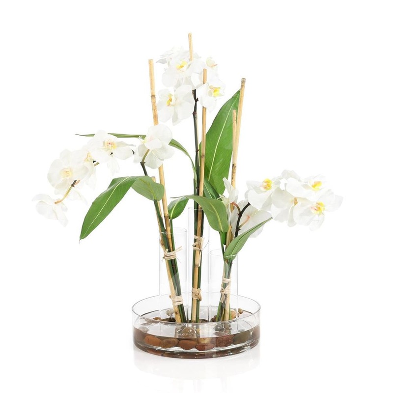 Transforming Florals 1 showcases removable bundles of green snowballs, amaryllis, cymbidium orchids, natural curly willow, and wildflowers. The arrangement is tied with gold wire in glass tubes, held in place by faux water in a long glass rectangular vase and Transforming Florals features removable bundles of orchids, water pickerel leaves, and natural river cane. The arrangement is tied with gold wire on a bed of natural river rock in faux water