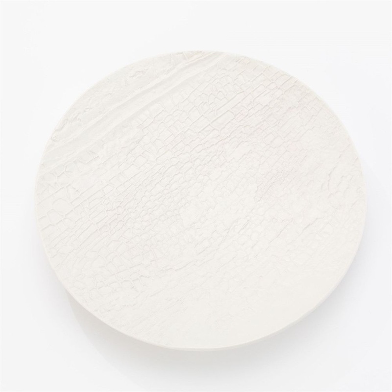 Description: Nature is recreated in this extraordinary Tree Texture Collection. This plate is made with the relief of a burned Poplar tree. Part of the tree that died but, the remainder of the tree is still alive.Truly taken directly from tree bark, molds are cast to then reinterpret into vessels and decorative accessories. This charger is glazed in matte white and can be displayed on a charger stand.