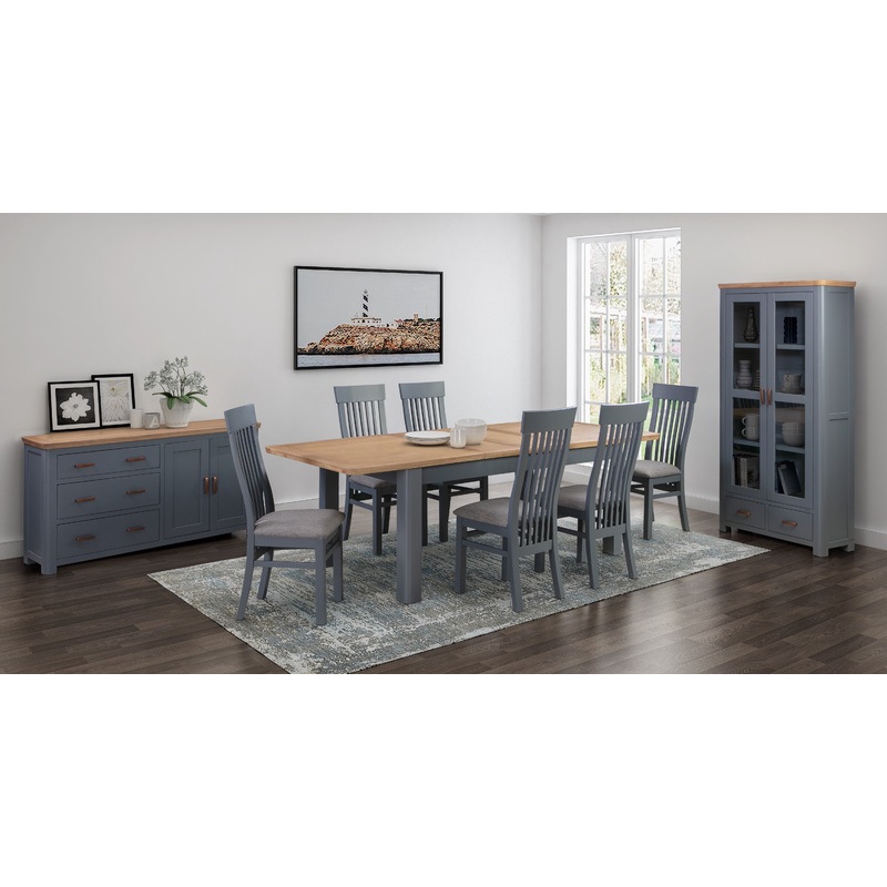 Introducing a stunning collection of furniture crafted from solid oak and selected oak veneer, finished in a luxurious mid blue. The curved leg and table edge design provide a contemporary twist to this sort after range and will light up any dining or living room space within the home.The fresh modern look still retains an abundance of character. Copper and oak handles are included with each piece within the display.