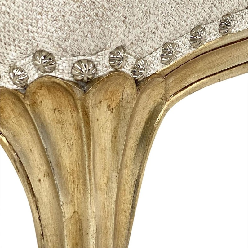 This upholstered, hand-carved armchair has a Valyrian gold fInish with decorative, nickel-plated nail trimmings. The button-tufted fabric completes the look.