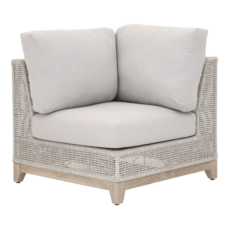 This alluring outdoor modular corner sofa chair will be an ideal addition to your patio or outdoor living space. It is just one component of a larger sectional outdoor sofa. You can easily connect this corner sofa seat with its matching modular pieces using its u-shaped clamp connecters. The modular sofa is suitable for many outdoor designs with its beachy look and transitional style. It is upholstered with a light gray olefin fabric that is weather resistant. The seat cushions are both reversible for easy cleaning, and removable for storing away in heavy weather conditions. The frame is covered with an intricately woven white and taupe rope that projects a light gray hue from a distance. The exposed wood base is constructed of teak wood with gray undertones. The neutral color scheme and simple look of the modular sofa exude a clean and airy aesthetic, which is perfect for a casual and inviting backyard atmosphere.