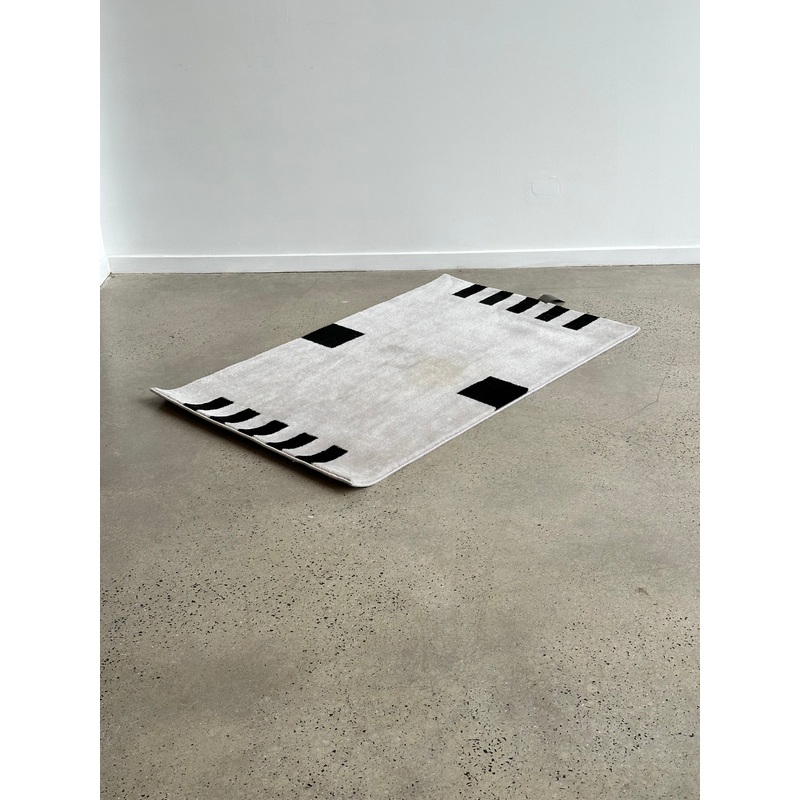 The rug features a contrasting black and white geometric pattern, arranged in striking rectangular blocks and lines. Its modern yet versatile composition makes it suitable for both contemporary and eclectic interiors.