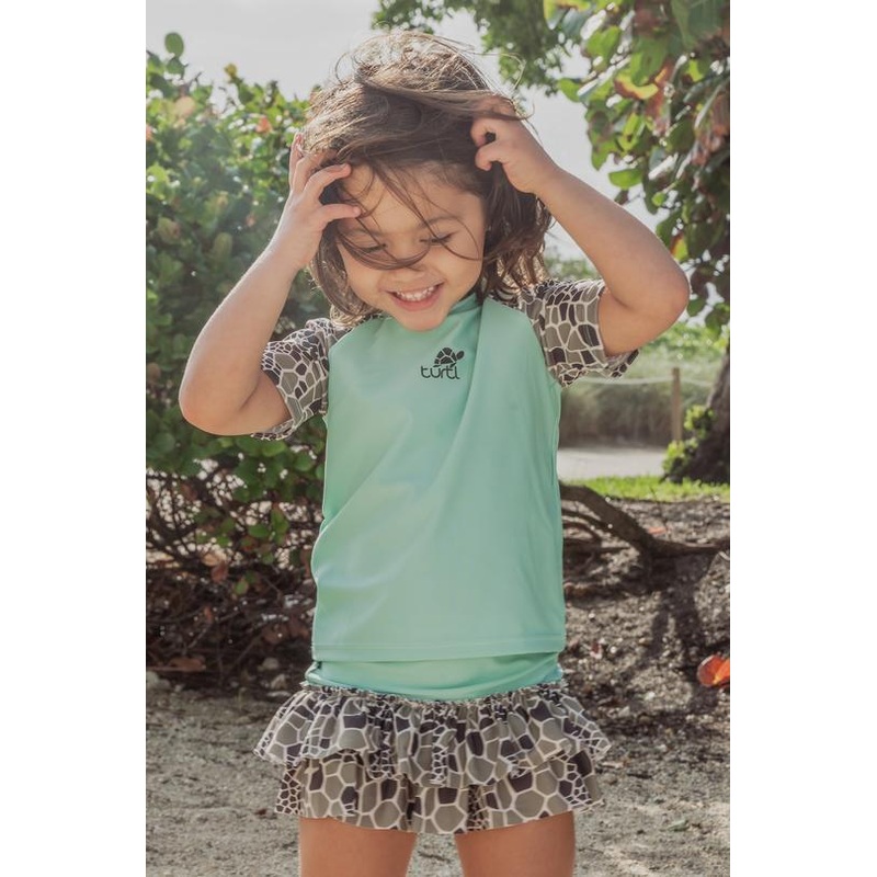 This two piece ruffled set is the perfect protective swimwear means your little ones are ready for their seaside getaways and paddling pool adventures! They can get into character with the cute turtle shell print on the short sleeves which coordinate with the elasticated ruffle bikini.