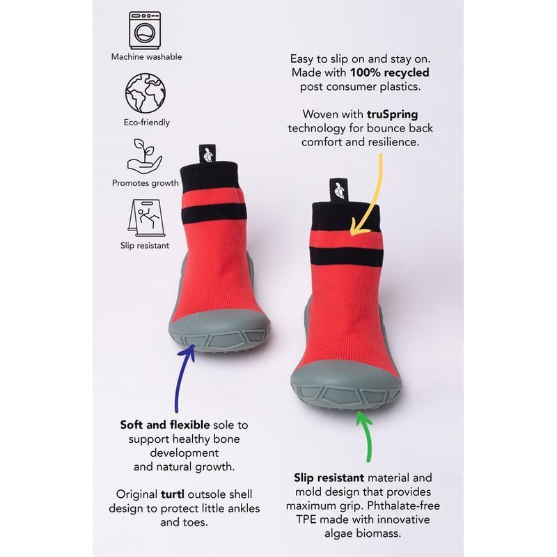Trips to the park or play parties at home, Turtlsocks in a shellare a tried and tested indoor outdoor sock shoe. These eco-friendly, lightweight, slip-on sock shoes have a slip-resistant protective shell that allows for movement, while supporting their little feet.
