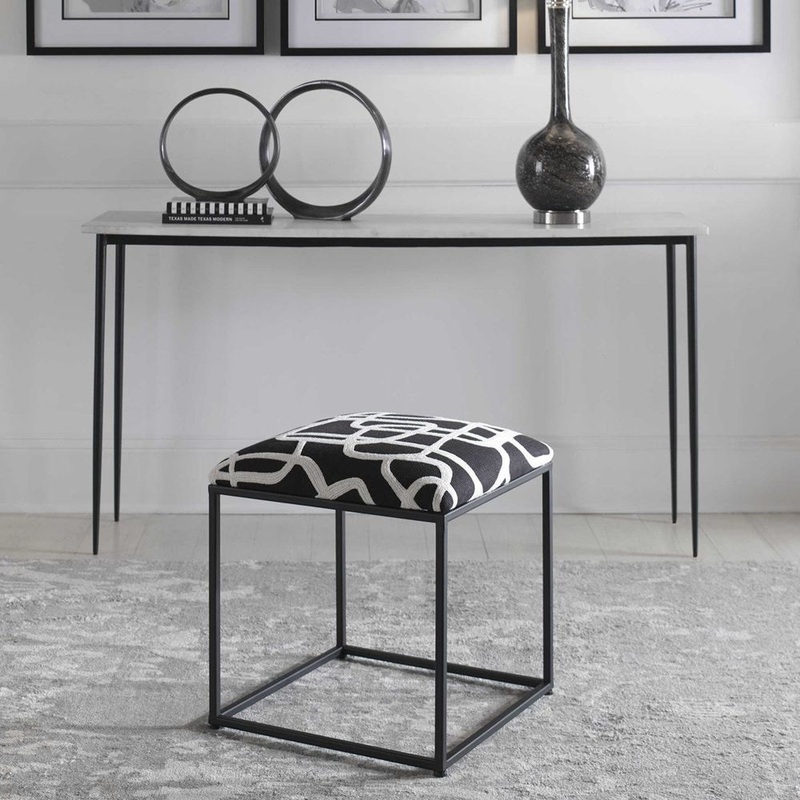 Sophisticated with a touch of whimsy, this accent stool features a cushioned seat upholstered in a contemporary black and white embroidered fabric, atop a matte black iron base. Doubles as added seating or a footrest.France and Son is an authorized seller of this product.