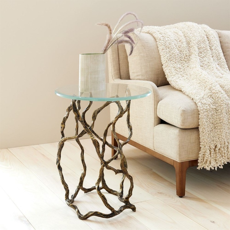 Description: The Twistwood Tables are handcrafted from cast iron with an antique brass finish, seamlessly combining the essence of nature with understated tempered clear glass surfaces.
