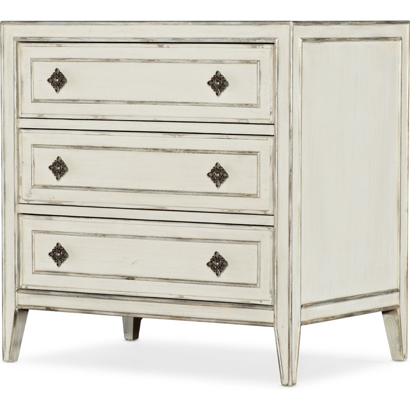 Light-catching and sparkly, this two-door, two-shelf mirrored nightstand will infuse your room with beauty and calm. Finished in Visage, an alluring patina of silver greige with amber glaze. Pursue serenity at home. Create your own personal sanctuary, a special place where you can experience comfort within.