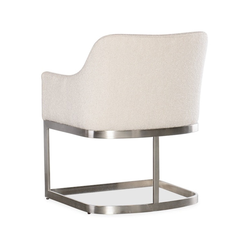 Cozy chic meets sleek sophistication with the Modern Mood Upholstered Arm Chair. The tactile and textural Boucle fabric in Inverness Natural contrasts with a brushed metal base in a warm pewter finish. Fully upholstered seat, back and arms. Unbound by geographical design, Modern Mood presents itself as an evolution of design choices, spanning a variety of decades and design movements, while maintaining an unmistakably modern aesthetic that transcends time. The 90-piece collection includes bedroom, dining room, home office, accent and occasional items characterized by substantive forms with soft architectural details. Elevated materials and brushed metal accents in a warm pewter finish are evident throughout the collection, including metal banding and edging as well as marble and glass accents. Crafted with flat cut quartered oak veneer with wire-brushed detailing, Modern Mood is presented in two finishes: Mink and Diamond. Delivering a dark, earthy brown with notes of black, Mink delivers a timeless aesthetic. A much lighter presentation is achieved with the crystal-like alabaster and pewter hues of the Diamond finish, delivering a soft sophistication.