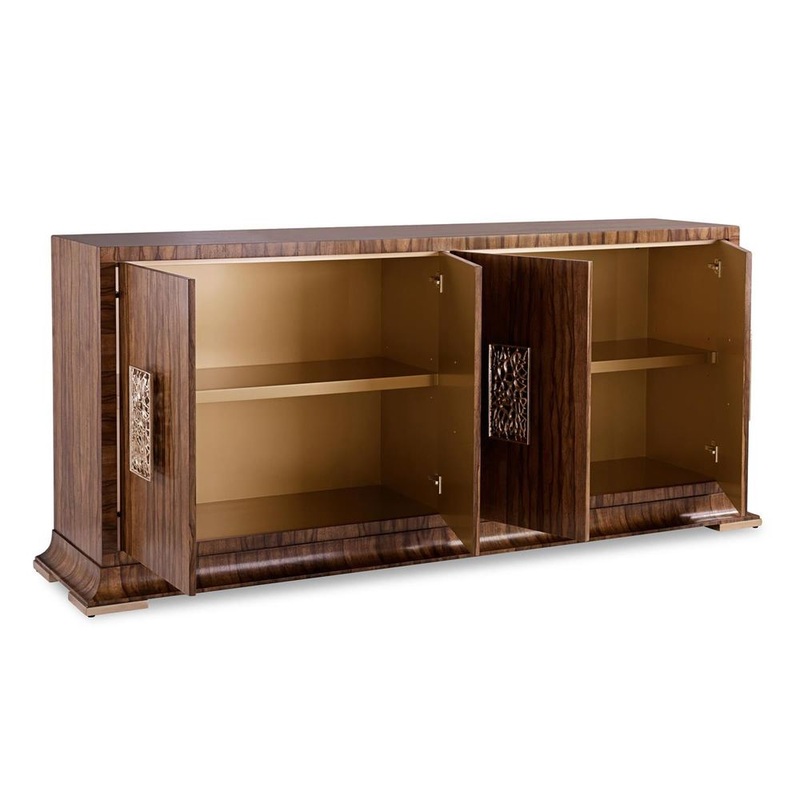 Valyrian Key Credenza is an elegant statement piece that showcases beautiful natural motifs. Crafted from ofram wood in a Moura finish, the piece features rich brown tones and intricate grain patterns. Aluminum handles in Valyrian Gold embellish the four push-latch doors, with abstract organic shapes that contrast beautifully against the structured silhouette. A stylish tapered base adds an elegant touch, completing the refined design. This credenza offers a cable cutout two interior compartments, each with a single adjustable shelf.
