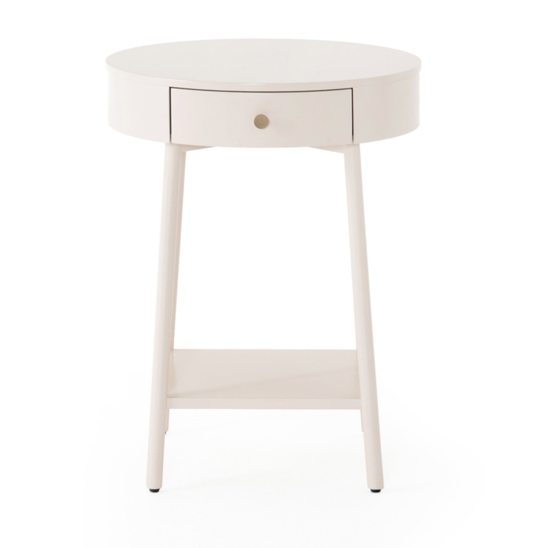 Finished in a dreamy off-white, an engineered hardwood nightstand features a single drawer and lower shelf, bringing both style and storage to the bedside.