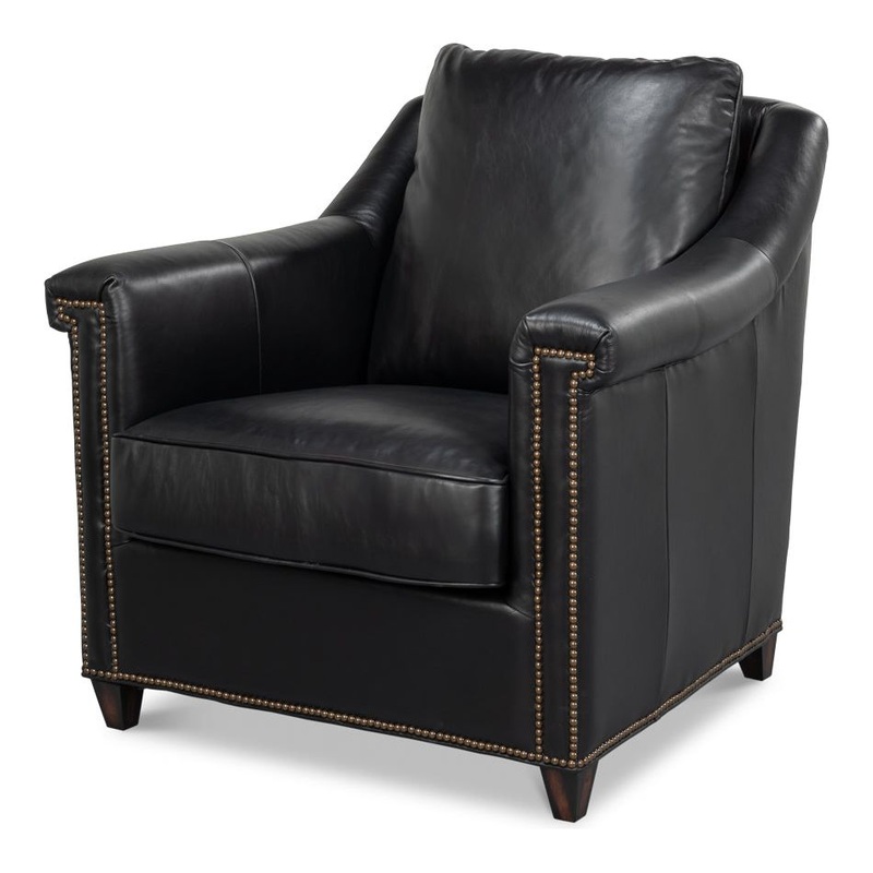 Description: Vandike Armchair. This armchair features rich, Onyx Black leather upholstery with a contrasting oak wood frame. Nailhead trim along the edges add a touch of classic detail. The chair”s comfortable design and elegant look, make it a versatile addition to living rooms or offices.