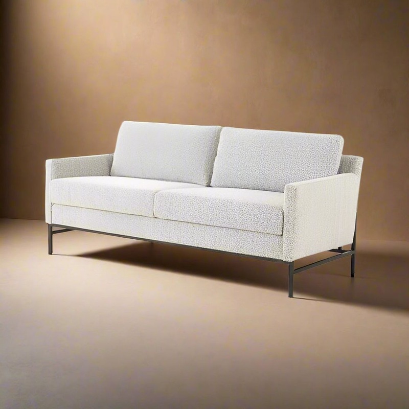 Plush and modern-minded. Atop an airy, ebony-finished iron base, thick, boucle-like upholstery features clean, angular track arms and comfy cushioning, for the best of both worlds. Performance fabrics are specially created to withstand spills, stains, high traffic, and wear, ensuring long-term comfort and unmatched durability.