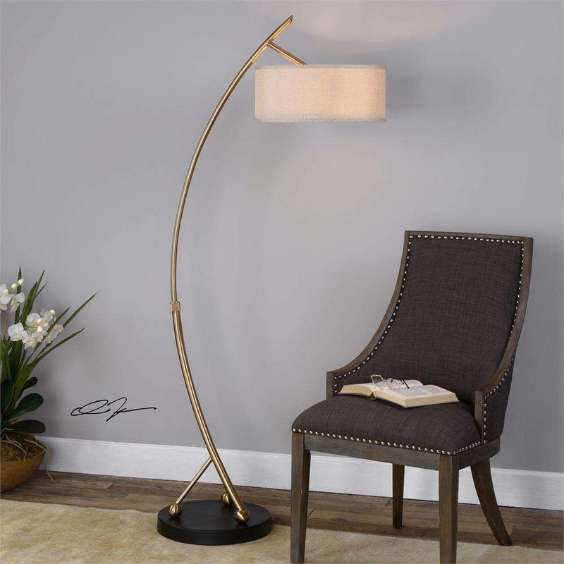 Curved Metal Finished In A Plated Brushed Brass Accented With A Matte Black Foot. The Base Allows For Adjustable Height. The Round Hardback Drum Shade Is A Rust Beige Linen Fabric.