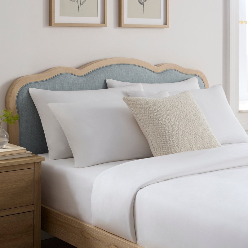 Featuring a solid natural wood-effect frame with subtle scalloped detailing, this bed frame combines lasting durability with timeless elegance. With a slatted wooden base for unrivalled comfort and support as you sleep, the headboard is upholstered in a stunning blue woven fabric, adding a touch of luxury and a pop of colour to your sleeping space. Regency-style legs provide the perfect finishing touch.