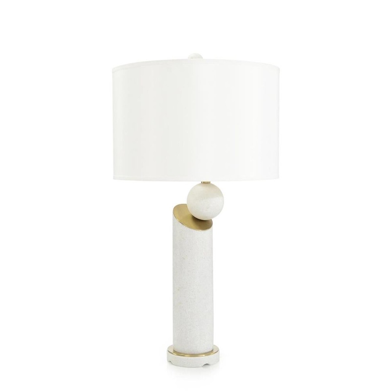 The Variation Table Lamp features a full range dimmer and displays a unique profile, infusing the atmosphere of a space with a sense of depth and artistic flair. Crafted from shimmering stone, the body and rounded base showcase a pristine white hue, complemented by Polished Brass accents. Atop the tapered body, a sphere of marble sits slightly off center atop the tapered body, matched by the rounded finial.