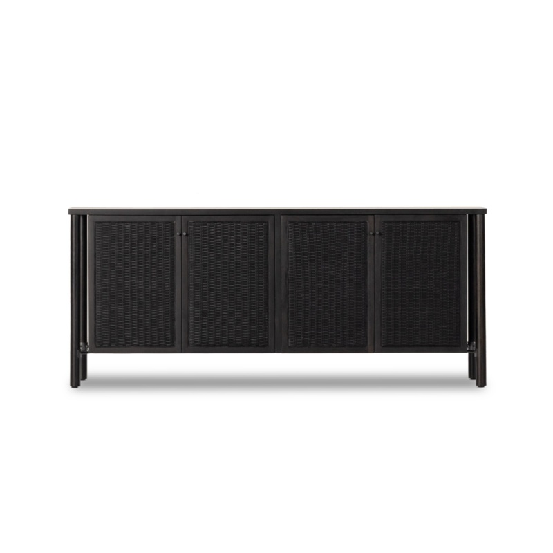 A modern weave pattern refreshes an ever-trending material. Solid mango encases cane door fronts with a black finish and textural basket weave. Dowel legs separate from casing for a float-like look. Spacious interior perfect for storing table linens and serve ware.