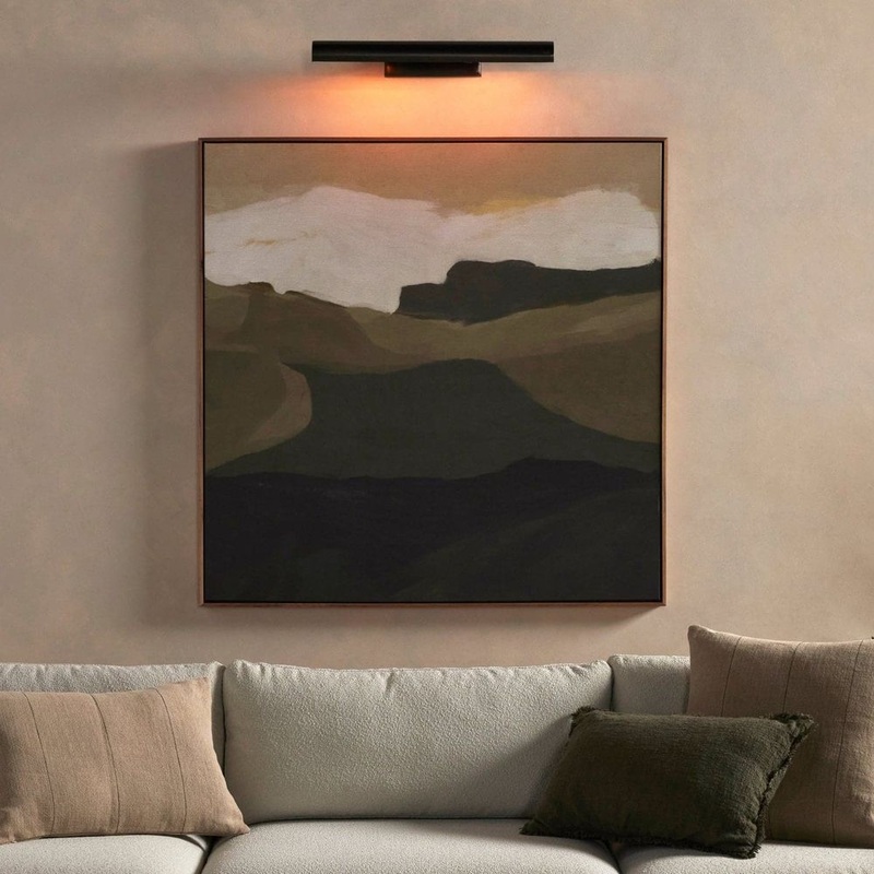Perfect for spotlighting a favorite piece of art. An elongated picture light features a warm burnt finish made by holding the material over an open flame. Great solo, even better in pairs.