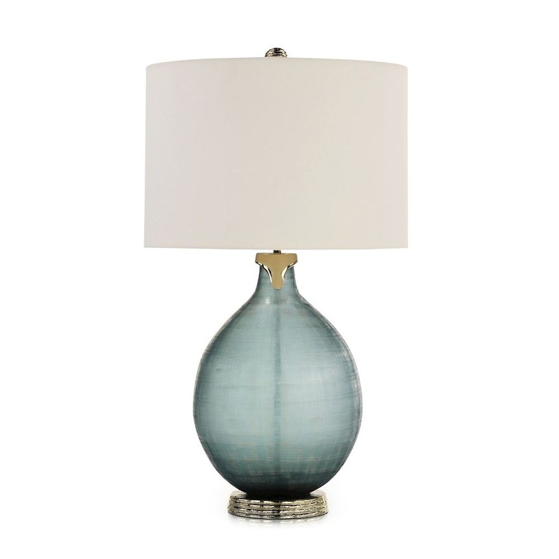 The Vincenzo Table Lamp elevates an interior space with an attractive sense of mystique. Crafted from gray glass with a crosshatch texture, this round table lamp showcases an asymmetrical neck accent of aluminum in Silver Champagne. The neck accent matches the texturally grooved base and ball finial, completing the look. This stylish lamp comes affixed with a white drum shade.