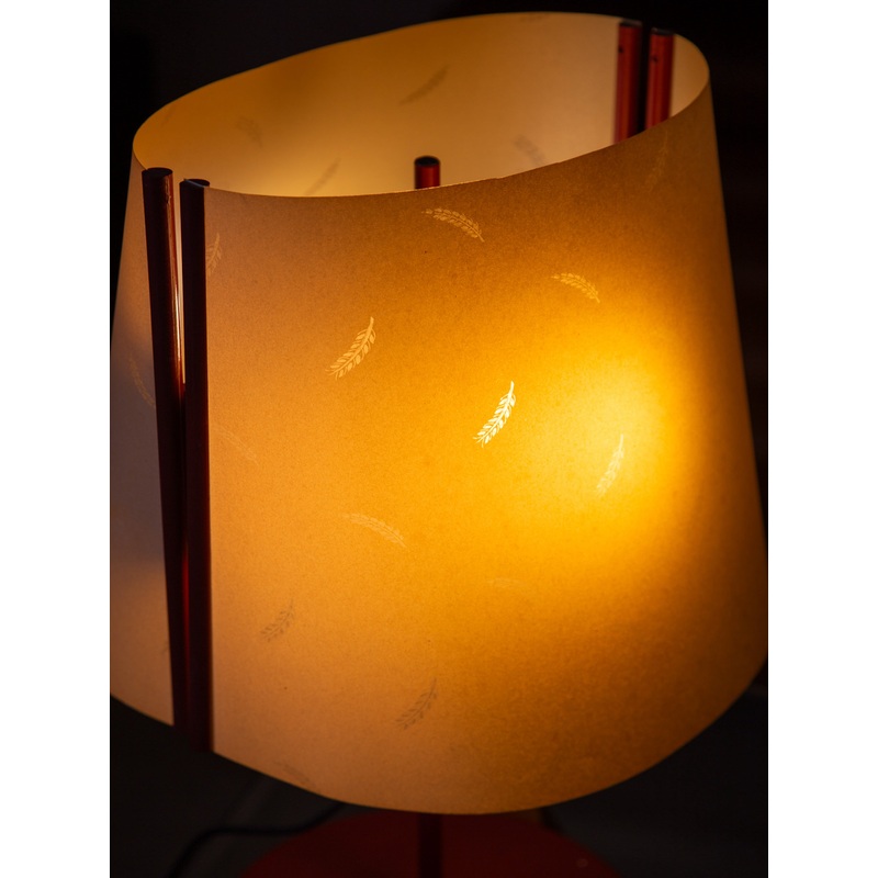 The lamps cylindrical stem and flat circular base are finished in a deep red lacquer, contrasting with the softly glowing original patterned paper shade. Its proportions make it ideal as a bedside lamp, desk light, or decorative accent, offering both functionality and style. A true vintage collectible that reflects the craftsmanship of Italian lighting in the 1980s.