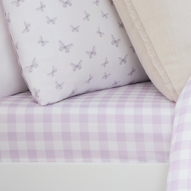 Have a comfortable nights sleep with our 144 thread count, 100% cotton fitted sheet. The lilac and white gingham pattern makes for a playful addition to a childs bedroom.