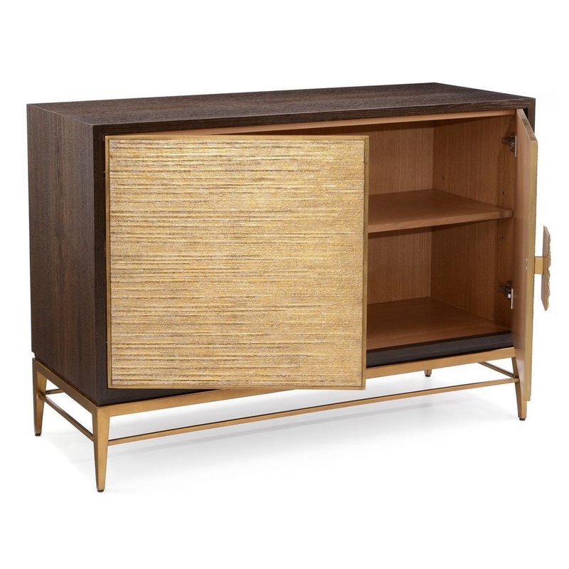 Description: This two-door cabinet is encased in smoked oak with gold cerusing, and it is mounted on a steel base in antique gold. The doors are inlaid in an antique gold linea oro finish and feature handles with tumbled glass beads.