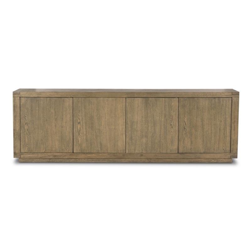 Worn oak shapes a streamlined box-style sideboard, with lap joint corners for a detail-driven touch.