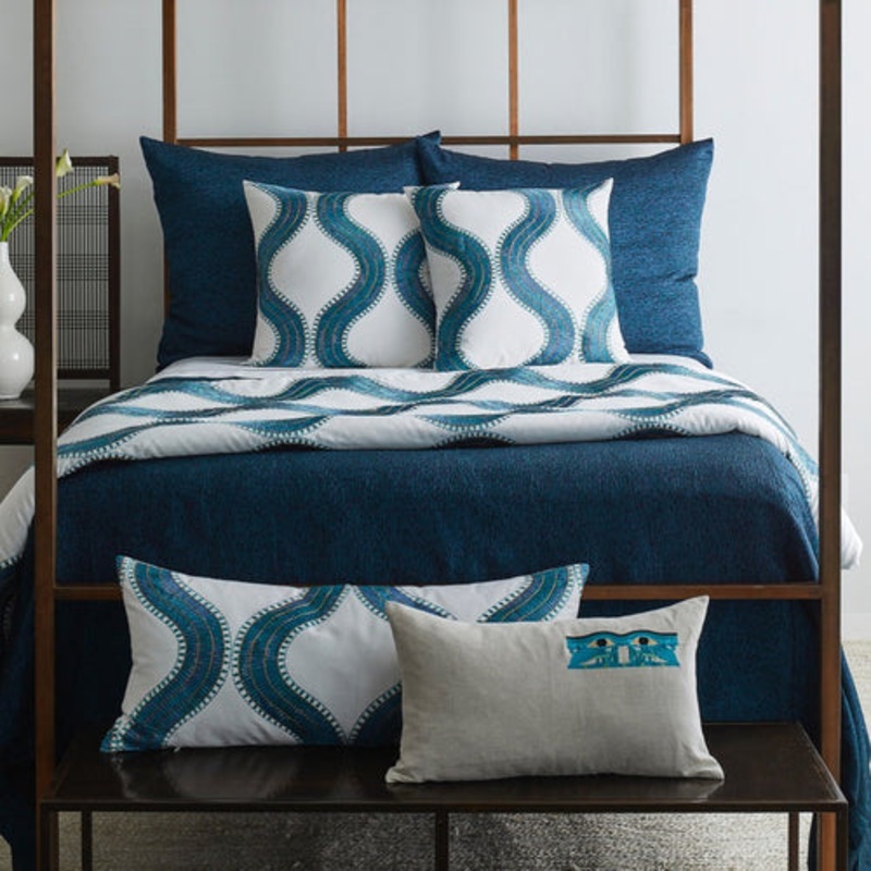 A popular amulet in ancient Egypt,the Wedjat Eyerepresented healing, regeneration and protection. A pair of vividly embroidered wedjat eyes gaze benevolently out of the corner this pillow.