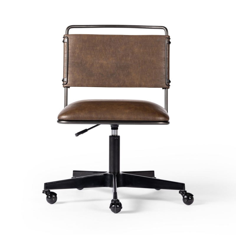Experience ultimate comfort and style with our Wharton Desk Chair in Distressed Brown. The slim lines and mixed materials create a sophisticated look, while the architecturally inspired matte black iron tubing adds a touch of elegance. Enjoy a 360-degree swivel and simply contoured seating for a luxurious work experience.