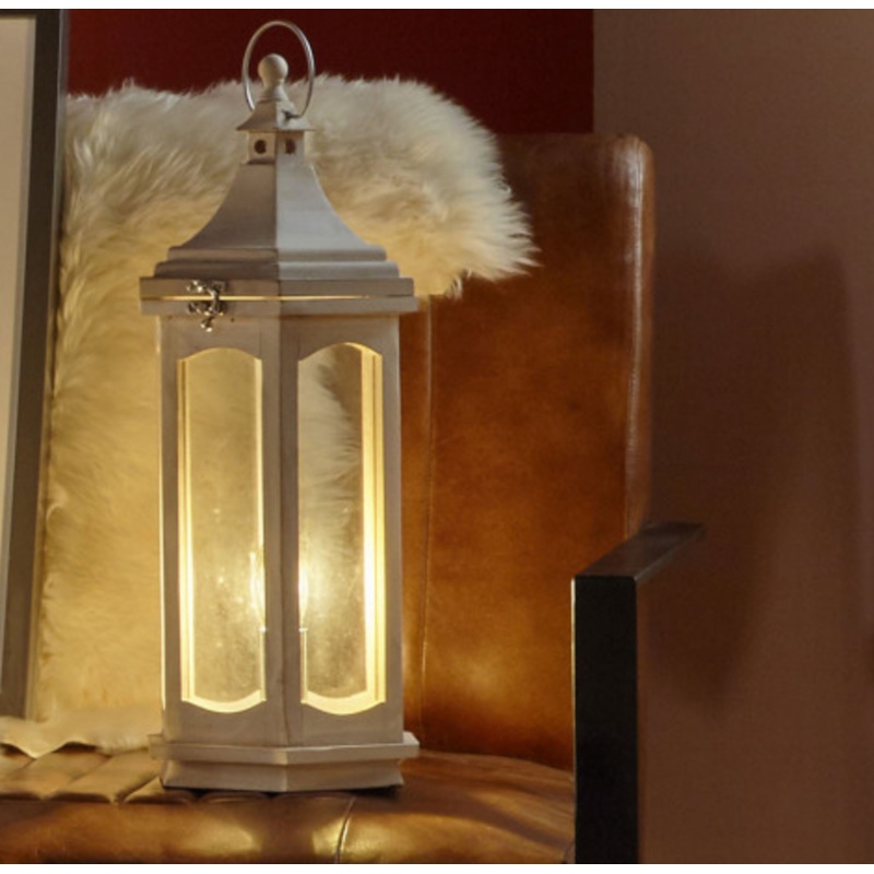 Bring some outdoor styling into your home with our white wash wood lantern table lamp. The shabby chic effect gives this light source a cosy, homely feel and would look stunning in any interior space.