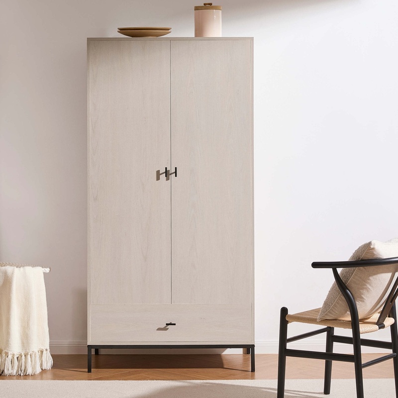 The double wardrobe is designed in a light wood effect and has sleek black handles and feet. Perfect for hanging and folding clothing – the wardrobe has a hanging rail plus a drawer to store t-shirts, jumpers, and folded items. The wardrobe’s clean lines and minimalist aesthetic make it a versatile piece that complements various interior styles.
