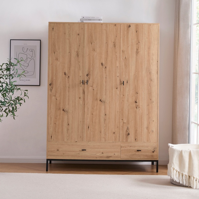 Designed in a natural wood effect with sleek black handles and feet, this spacious triple wardrobe offers ample room for both hanging and folding clothing. Inside, you’ll find two hanging rails for your wardrobe essentials and two drawers to neatly store t-shirts, jumpers, and other folded items. With its clean lines and minimalist aesthetic, the Willow 3-door wardrobe effortlessly complements any interior style.