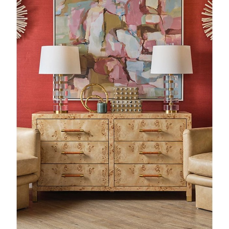 Description: SIX DRAWER CHEST WITH RATTAN WRAPPED HANDLES IN BURL WOOD