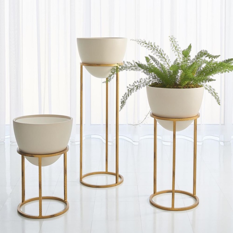 Description: The Wise Egg Planters are a chic way to bring some life into your home. The stands are iron with a gold leaf finish, the eggs are iron with an ivory painted finish and include a removable plastic liner, making them watertight. Available in three stand heights.
