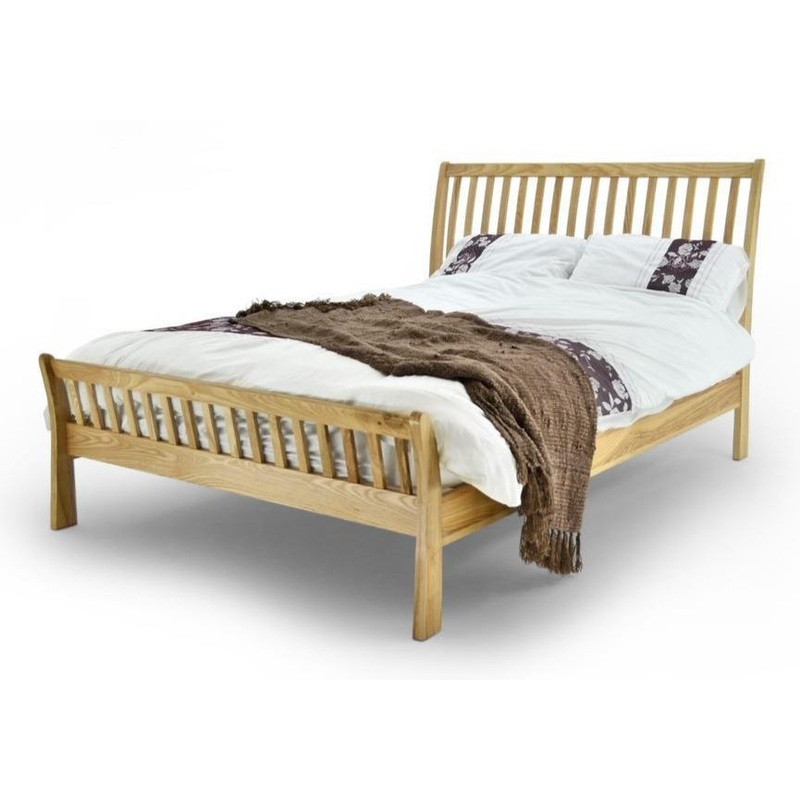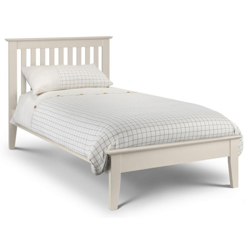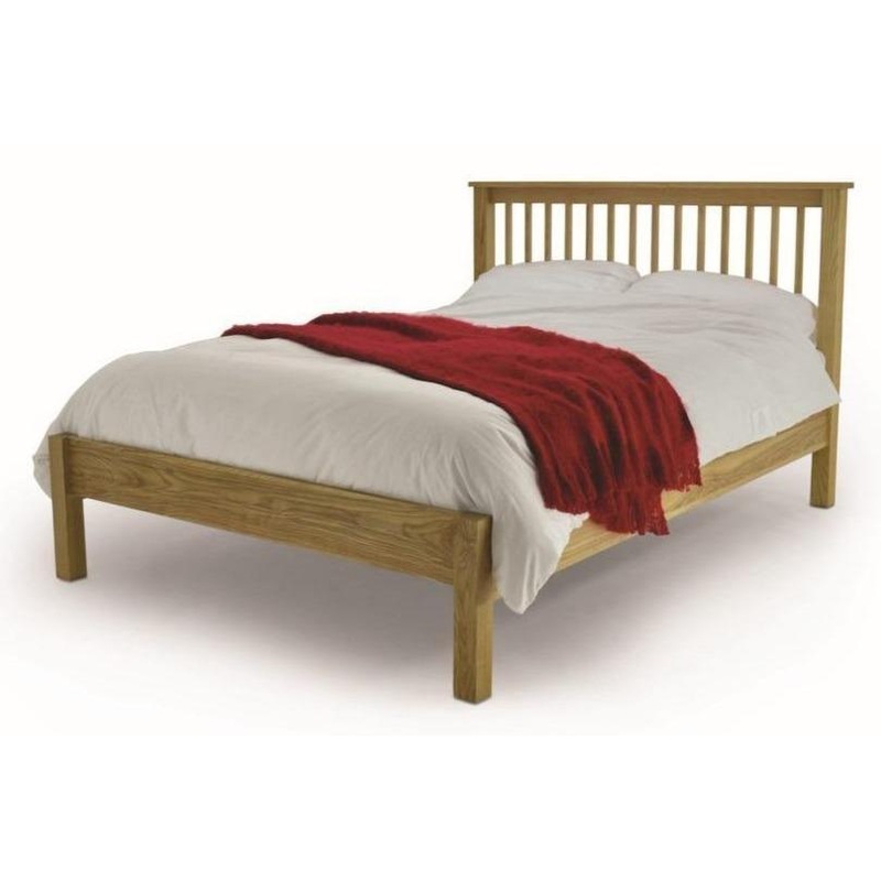This chunky bed features a classic construction with a slatted headboard and matching low foot end.