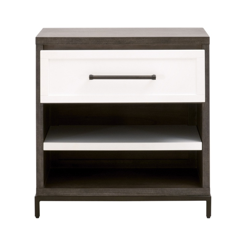The Wrenn 1-Drawer Nightstand by Essentials For Living is a transitional piece with a unique look. The piece boasts a harmonious blend of warm burnished brown hues on the wood frame, a matte white finish on the drawer and shelf, and antique bronze accents. These contrasting colors give this beside table a versatile look that complements a variety of interior designs. It is constructed from acacia veneer, lacquer, solid rubberwood, and stainless steel. The acacia veneer is smooth with a subtle wood grain, offering a timeless and classic look. The storage drawer features full-extension metal drawer glides, a hold-in detent to prevent drawer roll-out, and a stainless steel handle with an antique bronze finish. The adjustable shelf provides additional storage options, while the metal base ensures stability and durability. Measuring 27.5″ wide, 17.75″ deep, and 28.5″ high, this nightstand will be an elegant and practical addition to any bedroom.