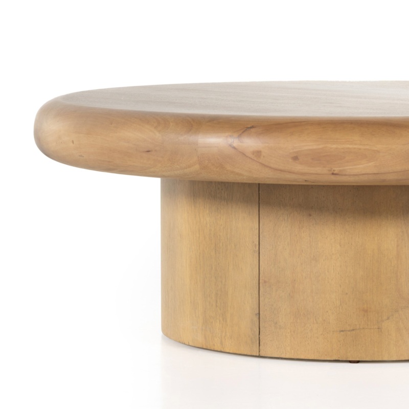 Turn up the volume. A pedestal-style base of solid burnished parawood supports a rounded tabletop with bullnose edging, for style and softness alike.
