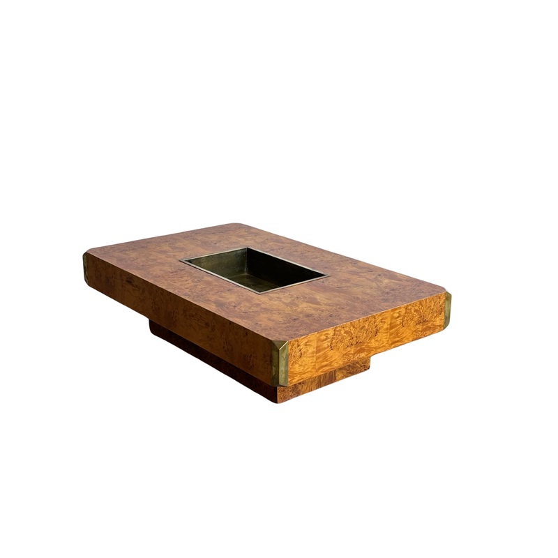 “Alveo” by Willy Rizzo for Mario Sabot Burlwood Brass Coffee Table 1970s